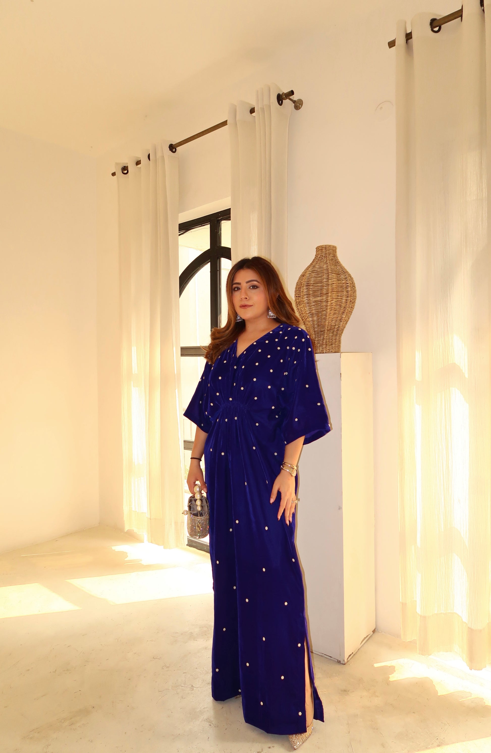 Our limited edition velvet kaftan, adorned with intricate pearl embroidery and a stylish back design, is the perfect go-to for an elegant indo-western look. Elevate your style effortlessly with this statement piece.