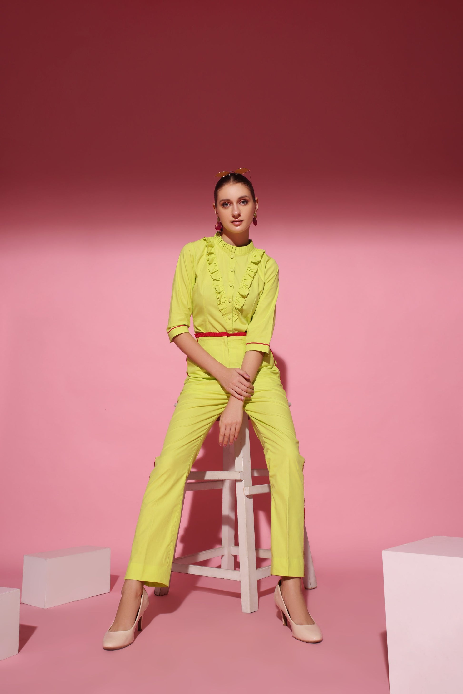 You won't be able to resist this captivating frill poplin coordset, featuring a striking belt that adds a touch of drama.