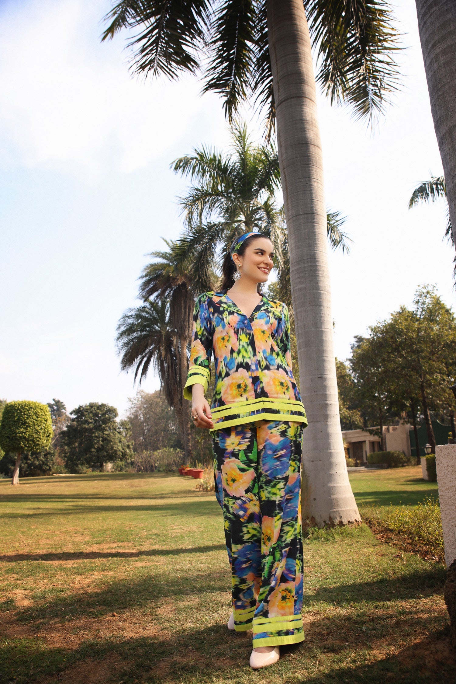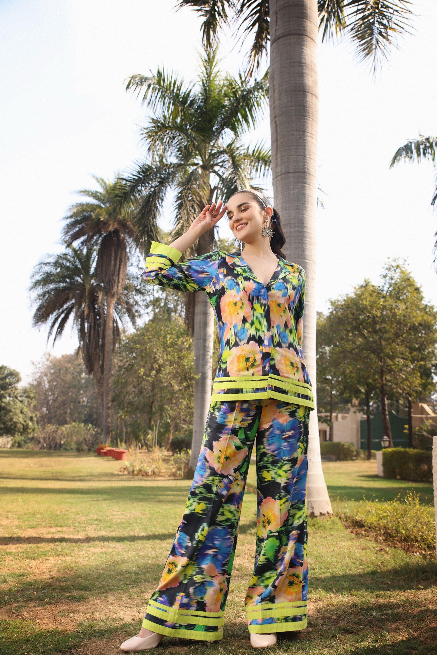 Embrace The serenity of The forest in style with this cotton - satin Coord Set. The dual-tone shirt and abstract print create A harmonious blend, making it A modern wardrobe essential.