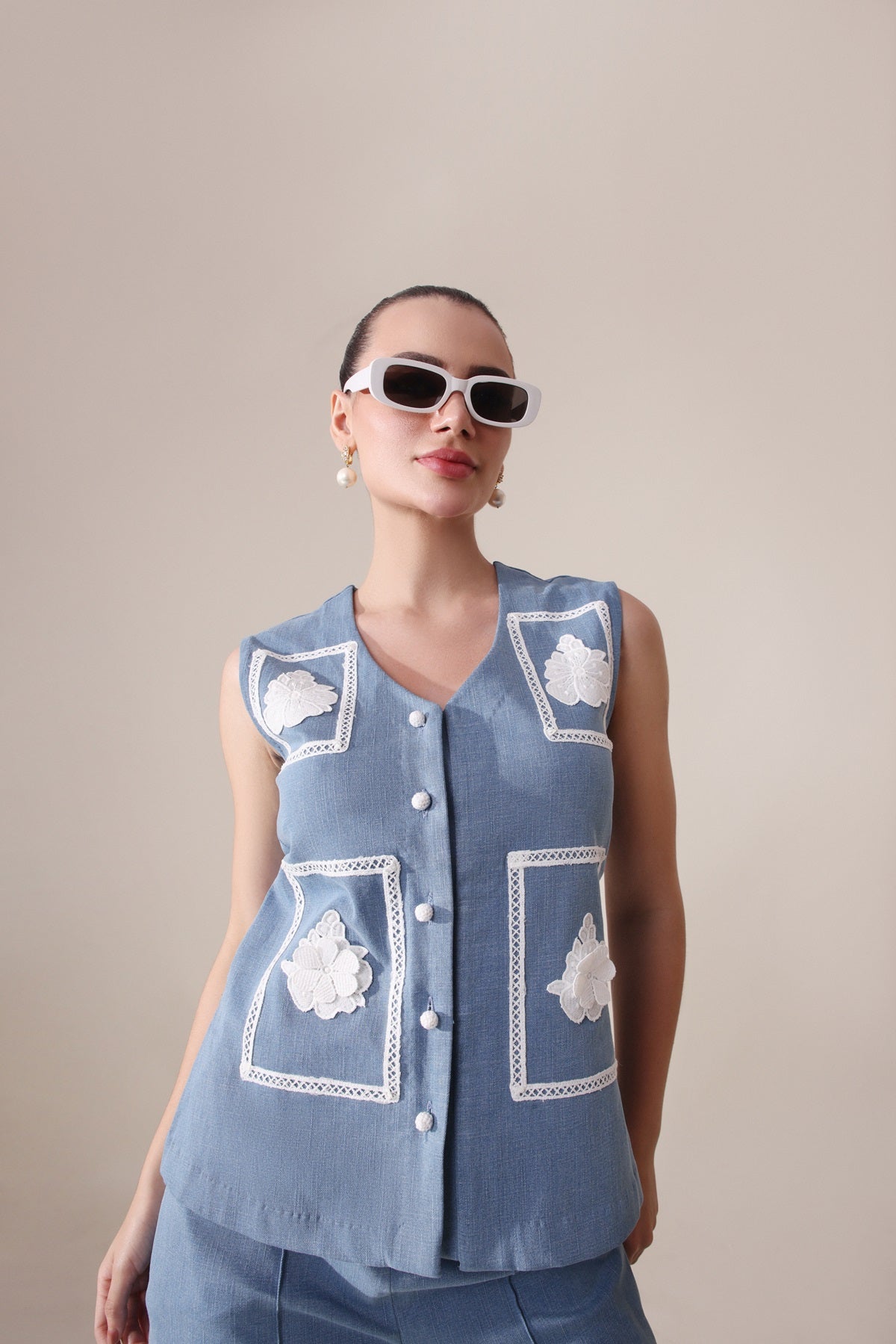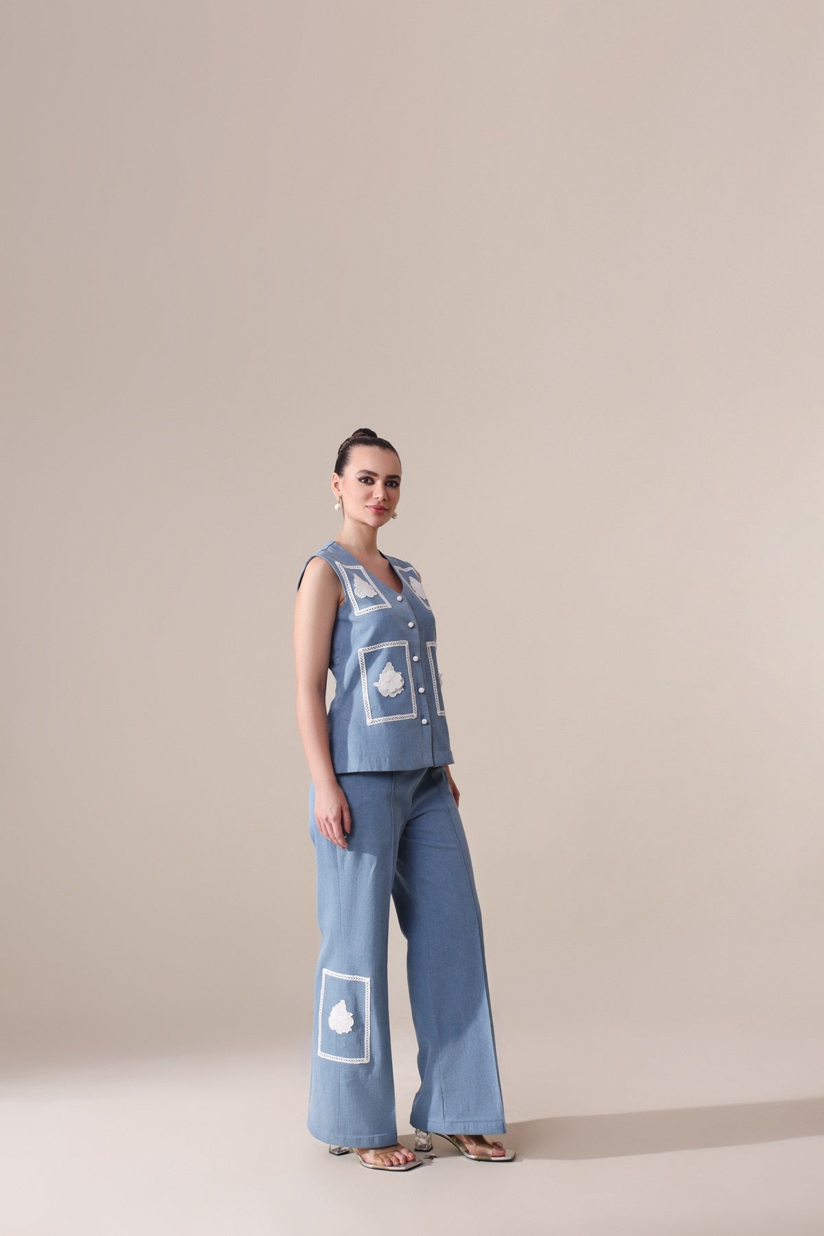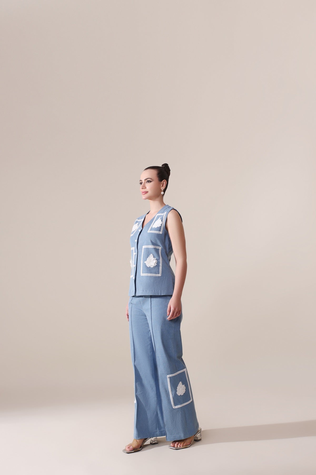 Make a statement with our denim set, featuring intricate lacework on both the top and pants for an elegant evening look. The top, measuring 23-24 inches in length, offers a modern, flattering fit, while the 40-inch pants create a sleek silhouette.