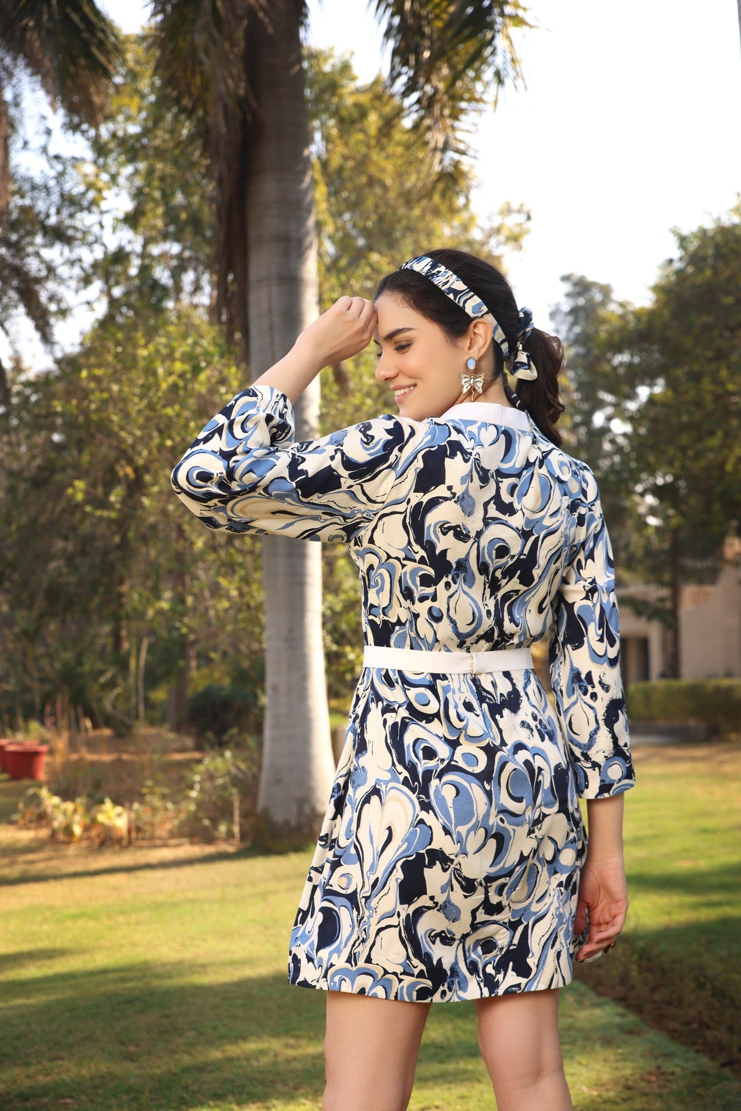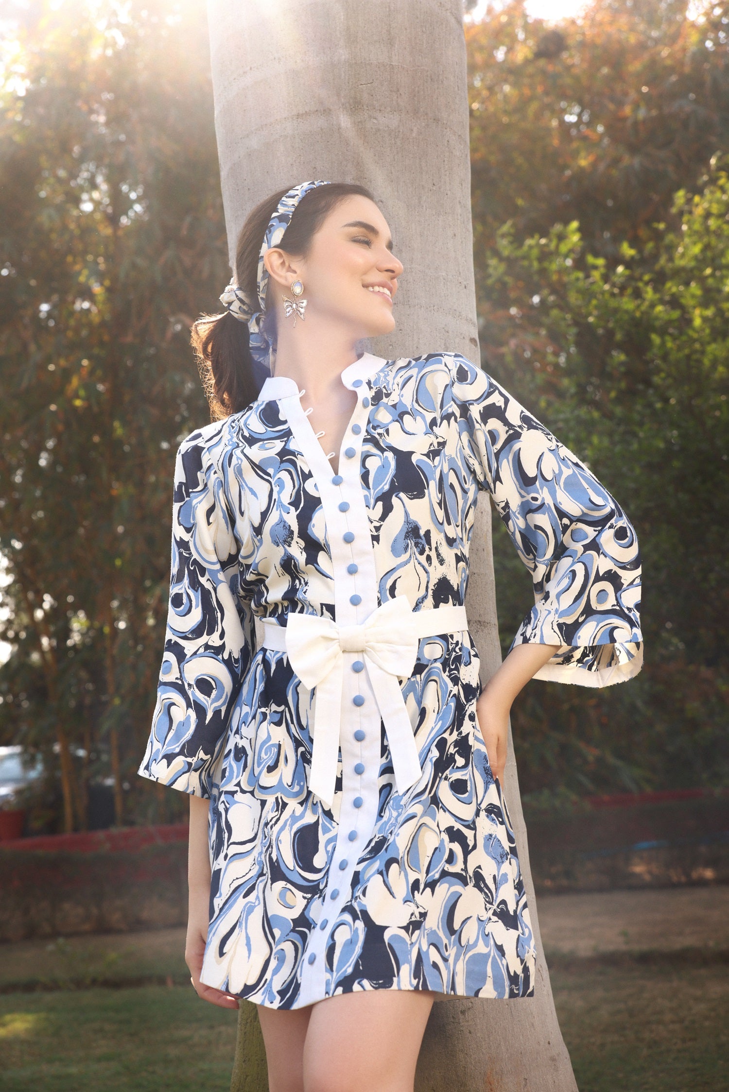 Step into the spotlight with this indigo print mini dress, accompanied by a detachable bow at the waist. Style it your way for a touch of personalized charm.