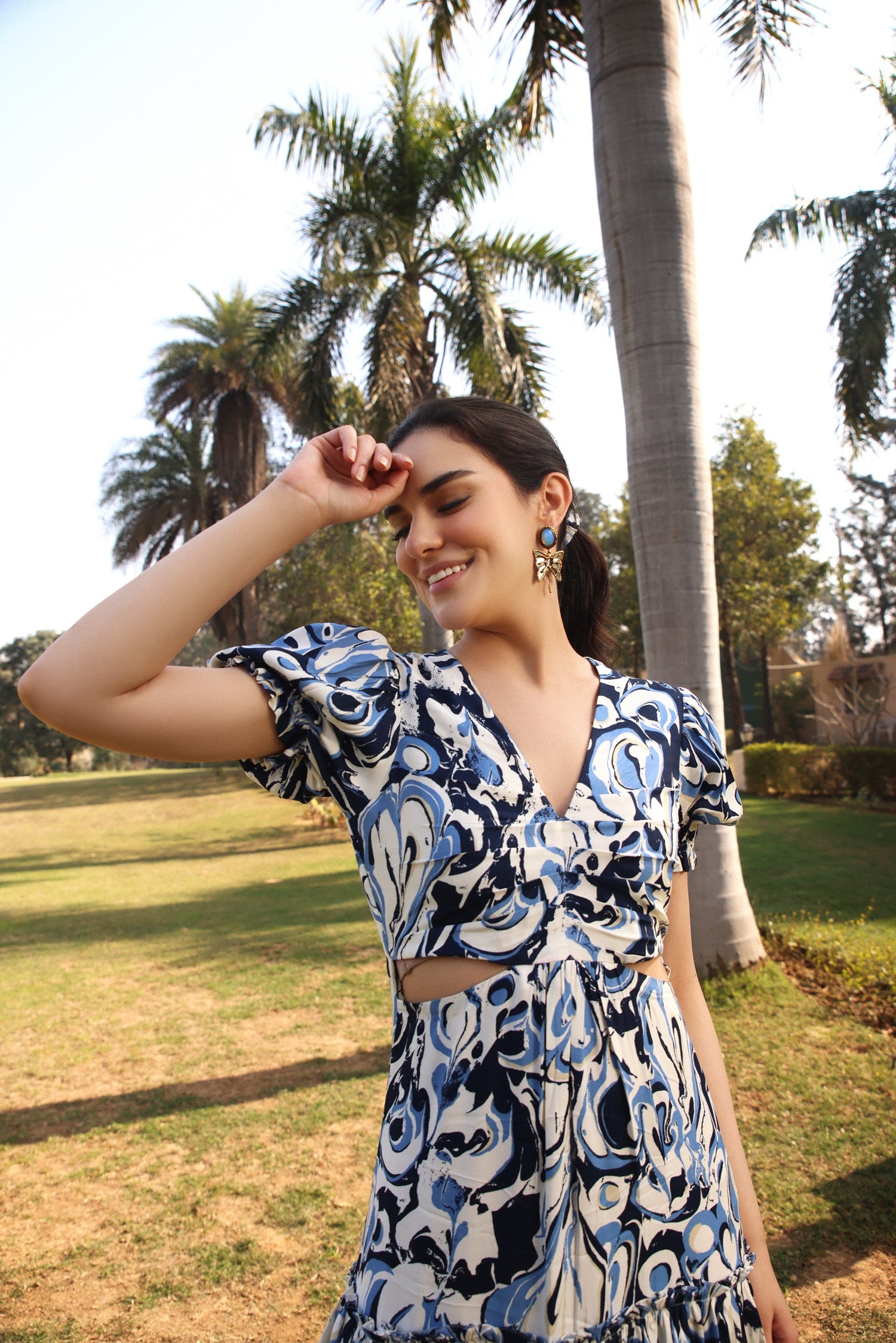 Unveil timeless elegance in this indigo print maxi dress. Gathers create graceful movement, while a waist cut-out adds a touch of allure. Embrace the perfect blend of style and sophistication.