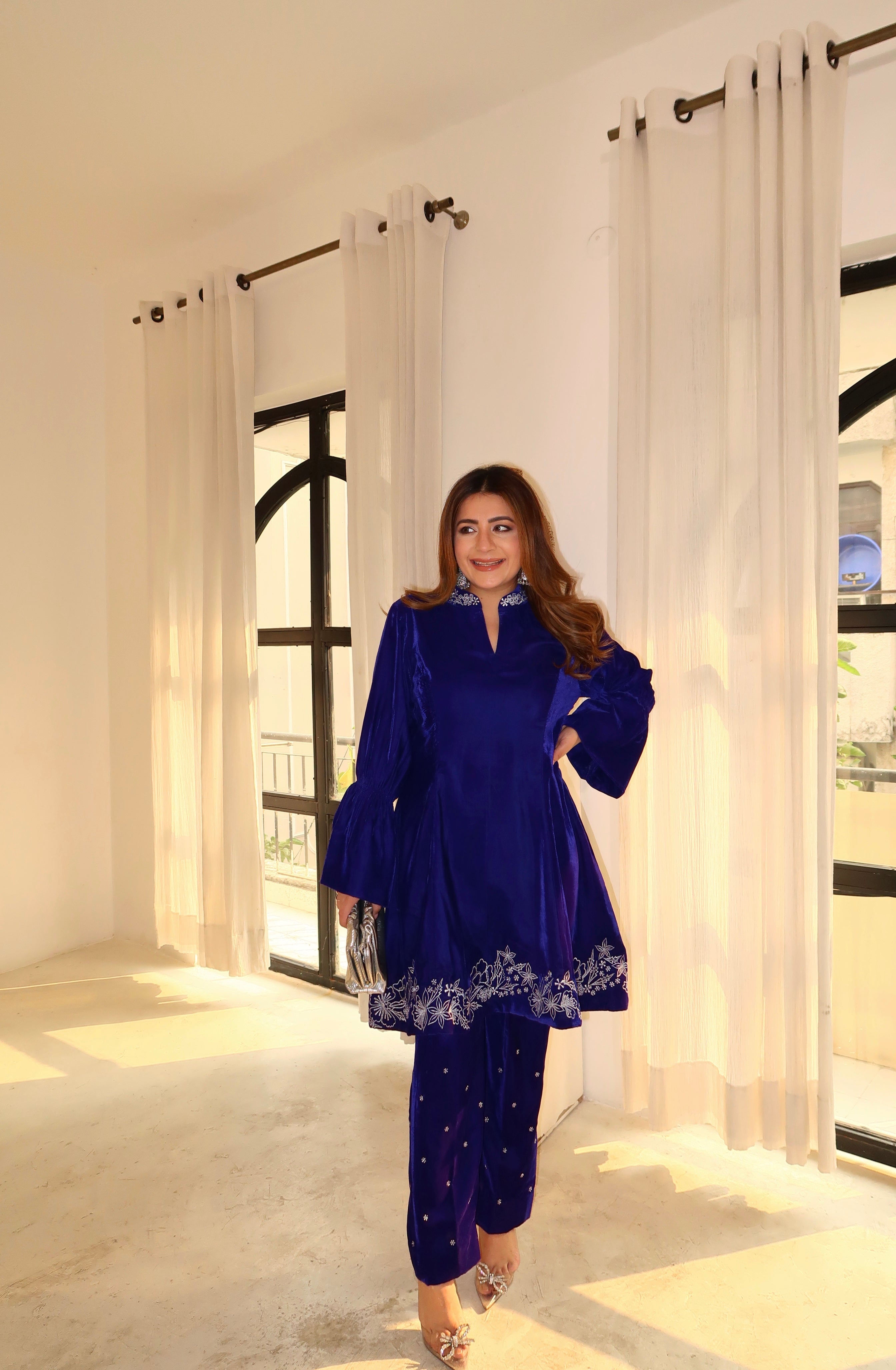 Our limited edition peplum set, featuring intricate zari and peal work on both top and pants, a must have.