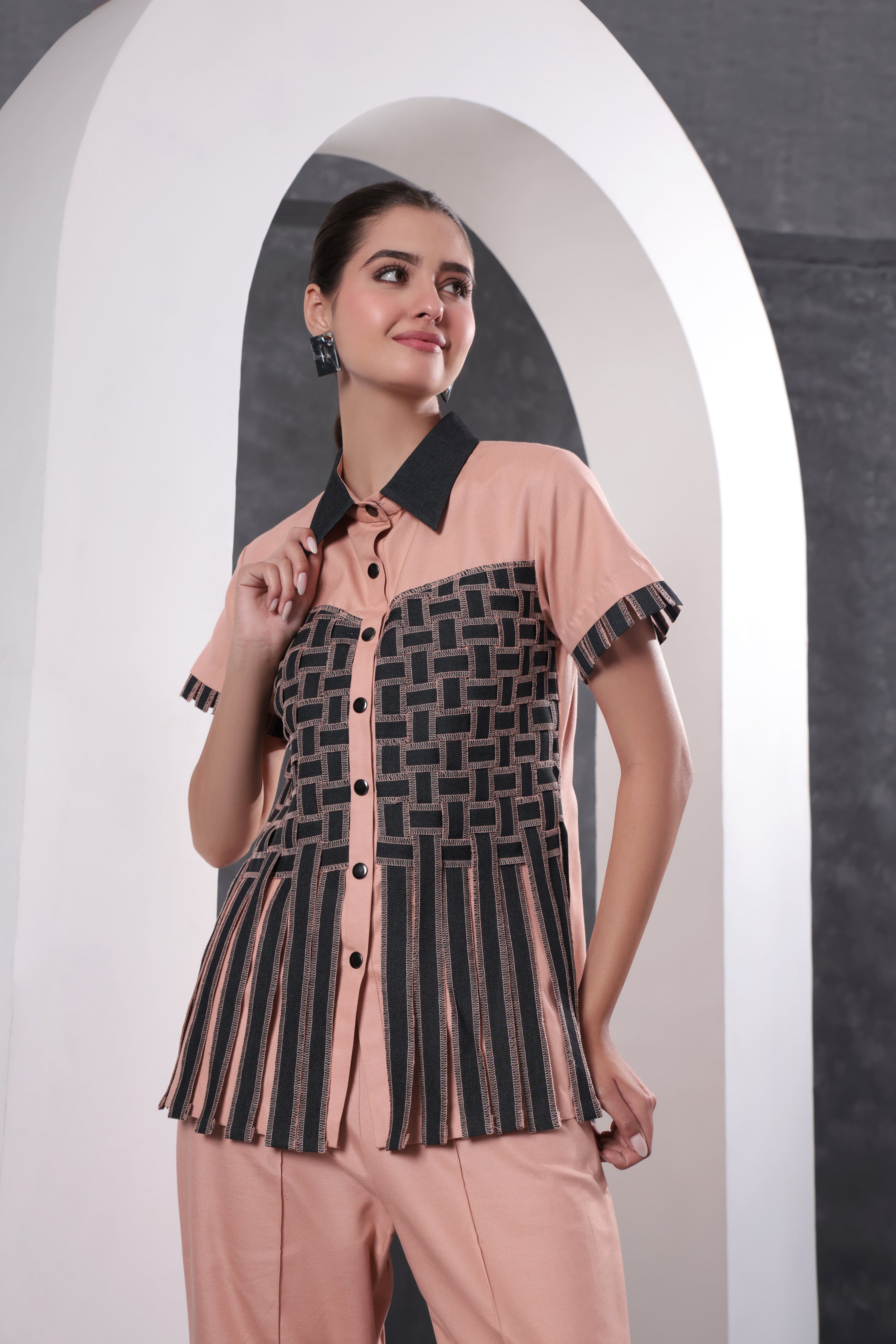 Redefine modern elegance with this ivory co-ord set crafted in breathable cotton, designed for effortless day-to-evening wear. The shirt features intricate woven detailing complemented by statement denim fringes along the hem, adding movement and a contemporary edge.