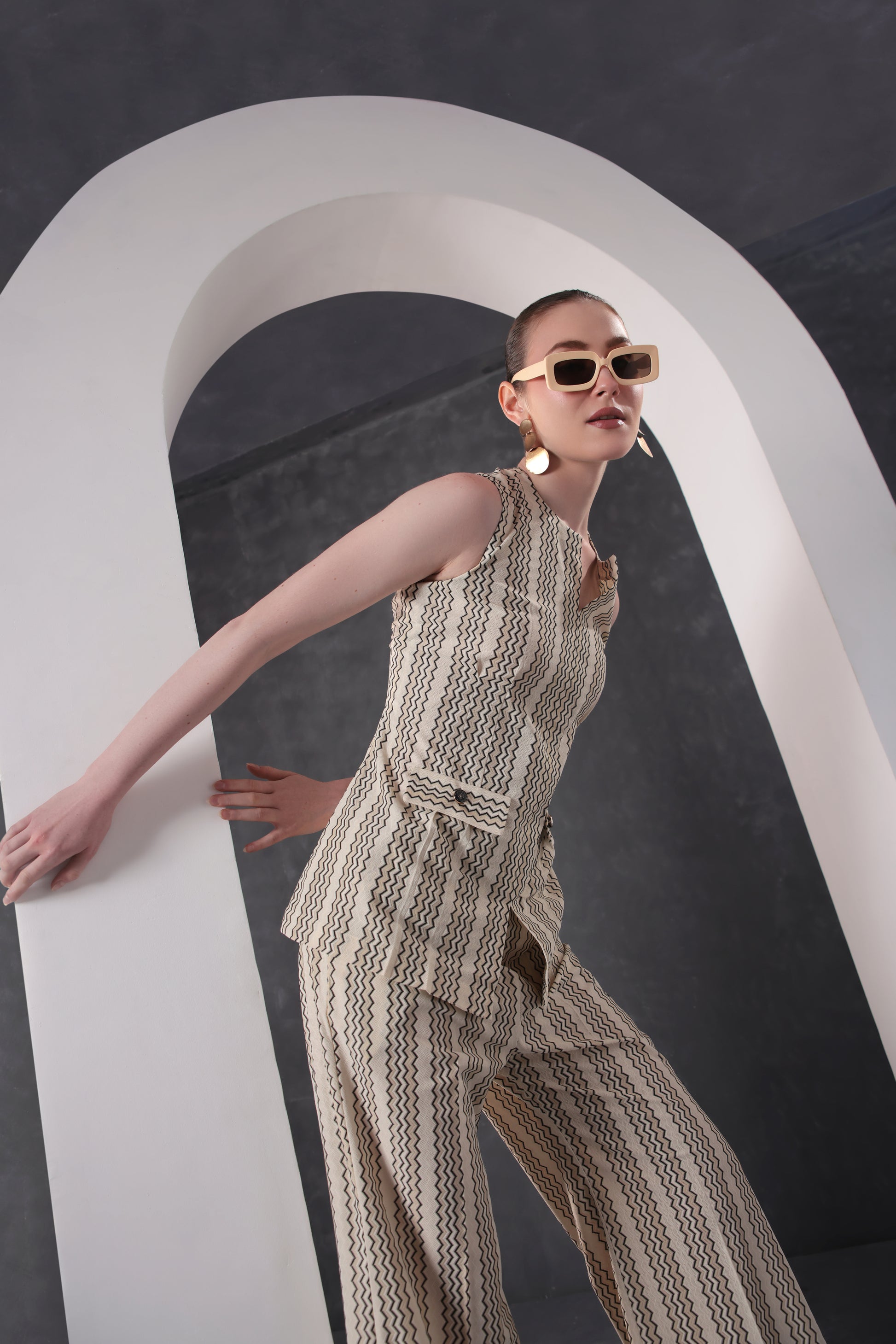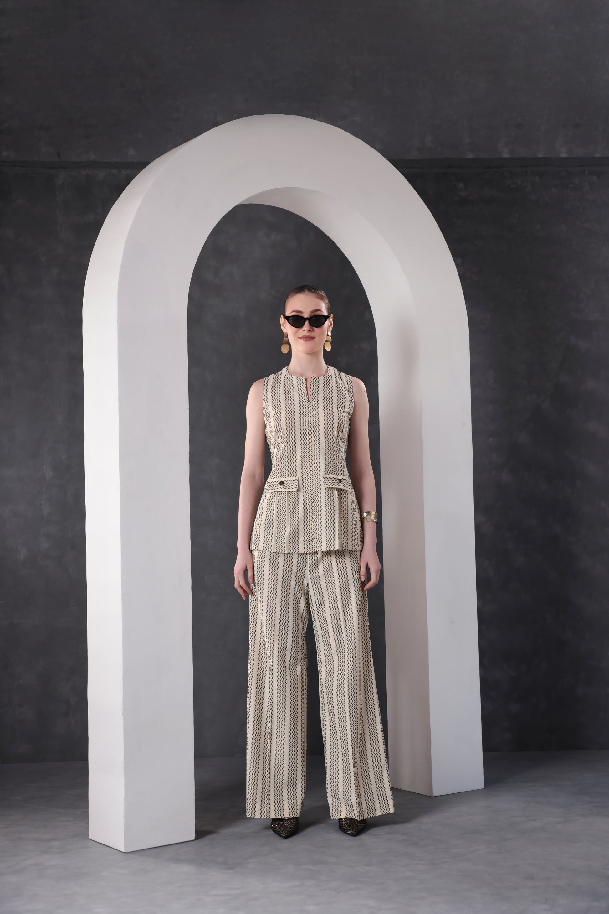 Crafted from premium self-textured fabric, the Sand Dune Co-Ord Set combines modern tailoring with effortless sophistication. The sleeveless structured top features a subtle geometric texture, paired with relaxed straight-leg pants for a clean, polished silhouette. The lightweight, breathable fabric ensures all-day comfort while maintaining a refined look. Designed in a versatile neutral tone, this co-ord set is perfect for workwear, brunch outings, and elevated everyday styling. Pair it with statement accessories for a sleek, contemporary finish.