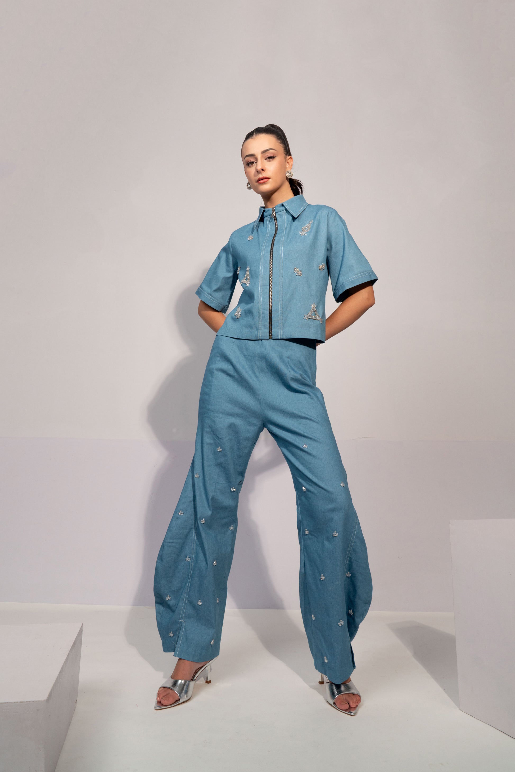 Turn heads with this hand-embroidered detailing jacket set, paired with stylish balloon pants for a bold twist. The intricate embroidery adds elegance, while the modern silhouette keeps it fun and trendy. A perfect pick for the upcoming season when you want to look effortlessly sassy yet chic.