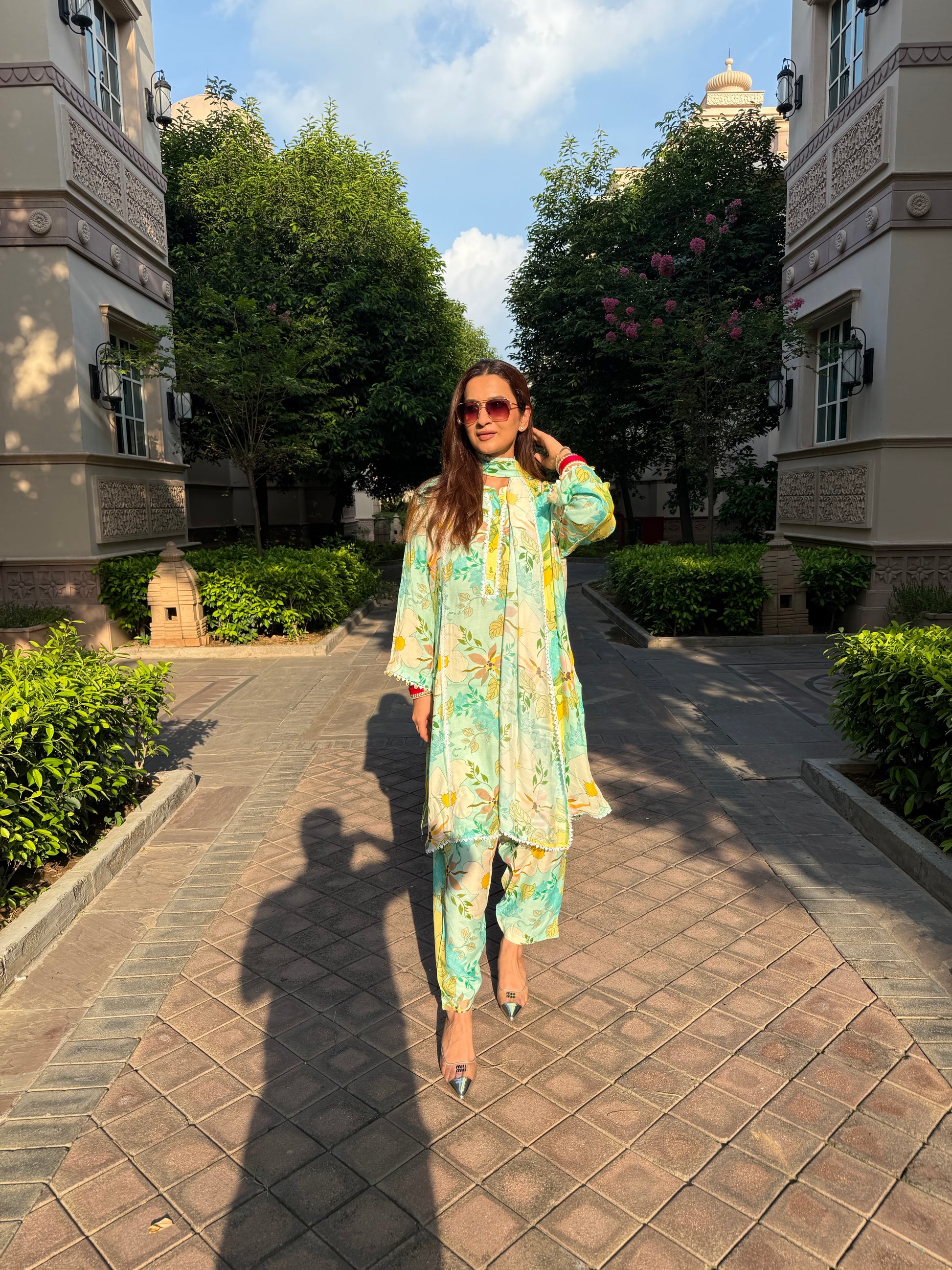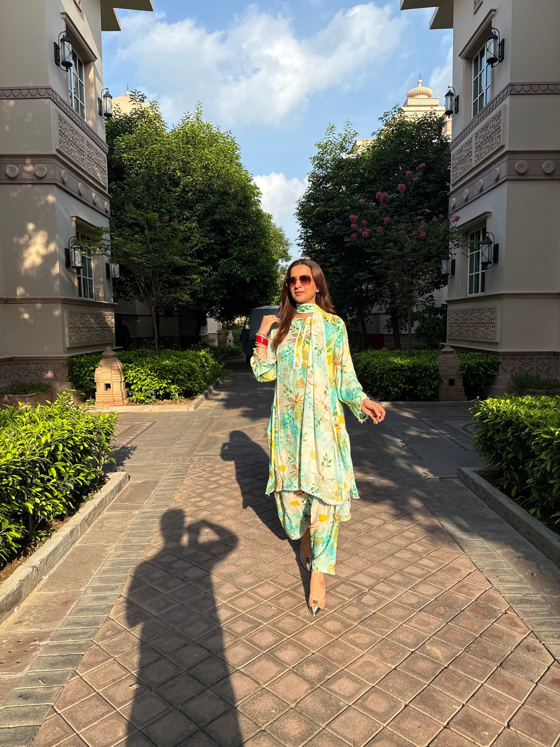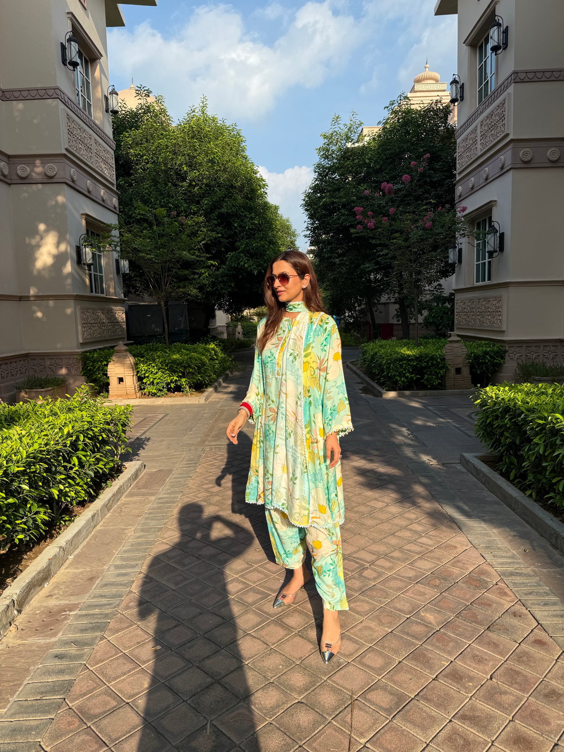 This set includes cotton print shirt and pant with a stole.