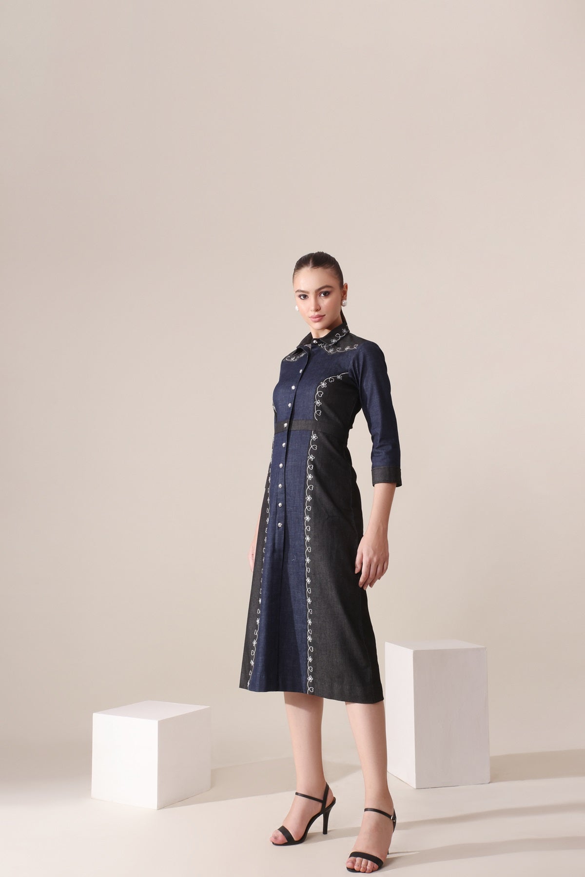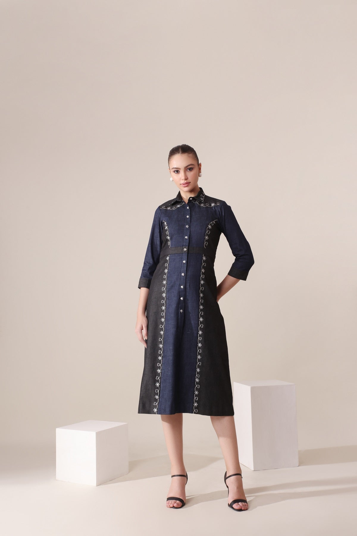 The intricate embroidery adds a touch of artisanal charm, while the two-tone design brings a contemporary twist to classic denim. Whether you’re attending a daytime event or a casual evening gathering, this dress is a versatile piece that’s sure to make a statement.